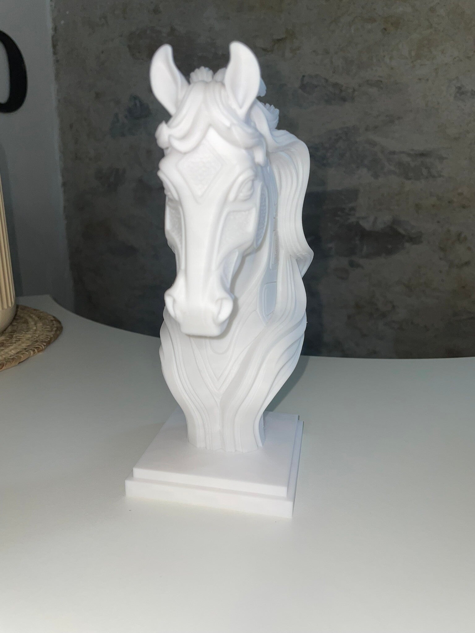 Sculpture “Hexa” – Tête de cheval moderne blanche, création design imprimée en 3D