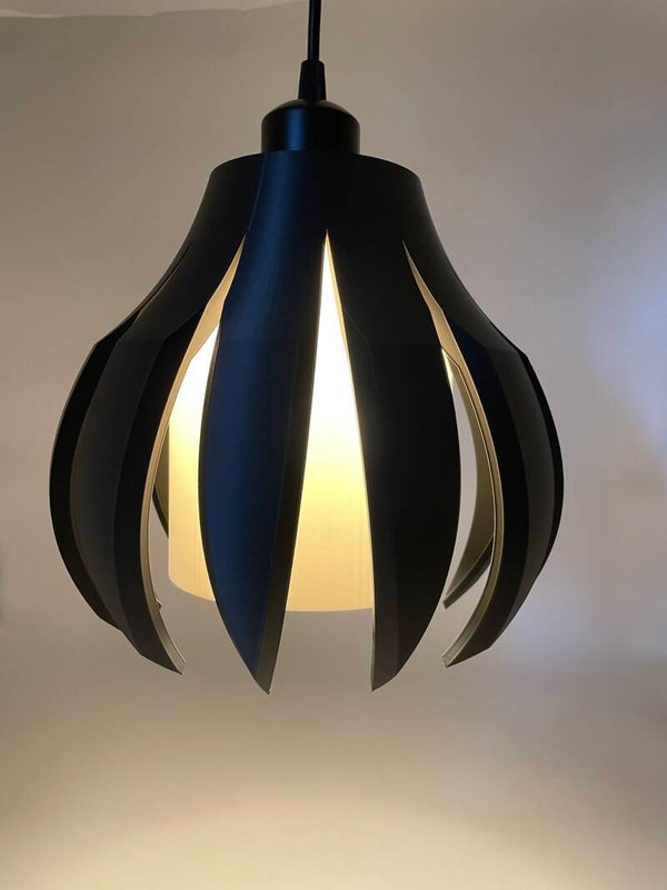 Imprimée en 3D en PLA noir mat pour la structure extérieure, et blanc satiné pour le diffuseur central