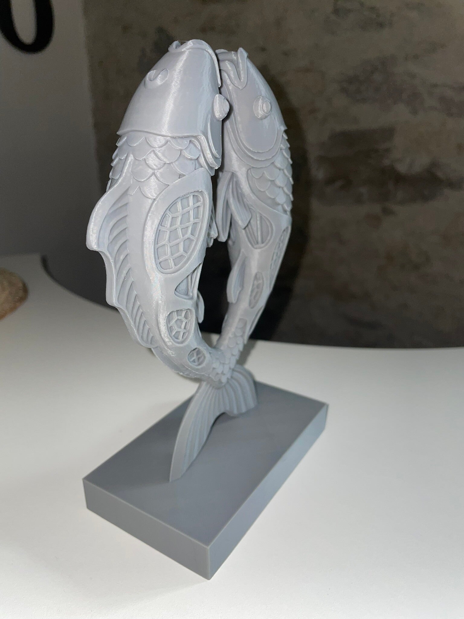 Ces deux poissons, inspirés de l’esthétique japonaise, s'entrelacent harmonieusement pour former une silhouette fluide et équilibrée — symbole de chance, harmonie et prospérité.