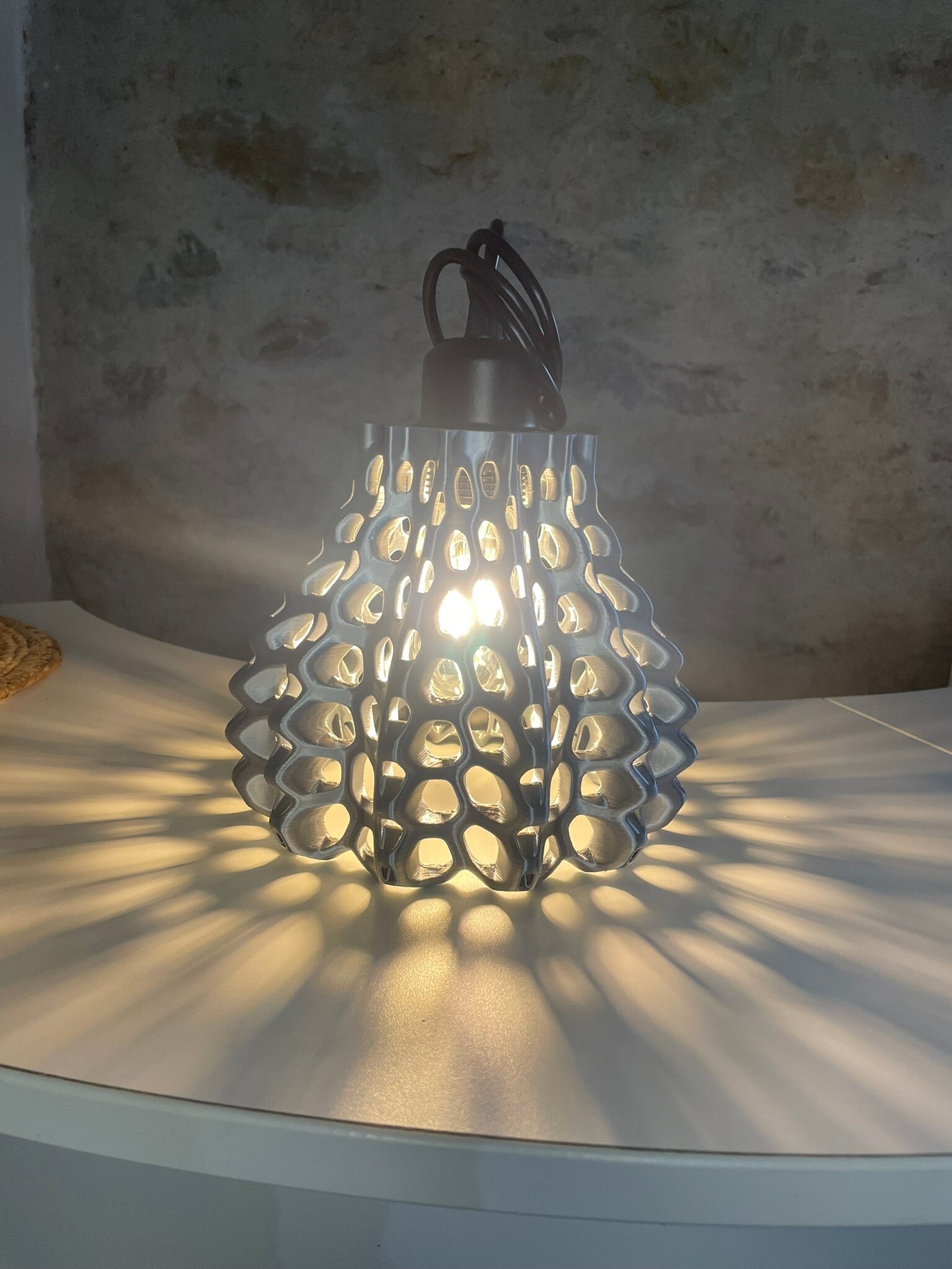Inspirée des formes naturelles et des alvéoles, elle joue avec la lumière pour créer un jeu d’ombres captivant sur les murs et le plafond.