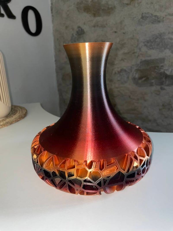 Un vase au design moderne et élégant, avec un dégradé de couleurs cuivrées / ambrées / rouge profond qui attire immédiatement le regard.