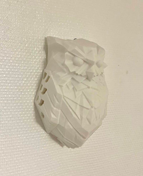 Applique murale HIBOU couleur BLANC en fil PLA biodégradable et écologique. Lorsque l'applique est allumé les ailes et la queue du hibou s'illuminent sur le mur. Interrupteur discret et alimentation par transfo par usb fourni et non par pile, éclairage led . Dimensions: hauteur 20 cm, largeur 12.3 cm . Objet de décoration