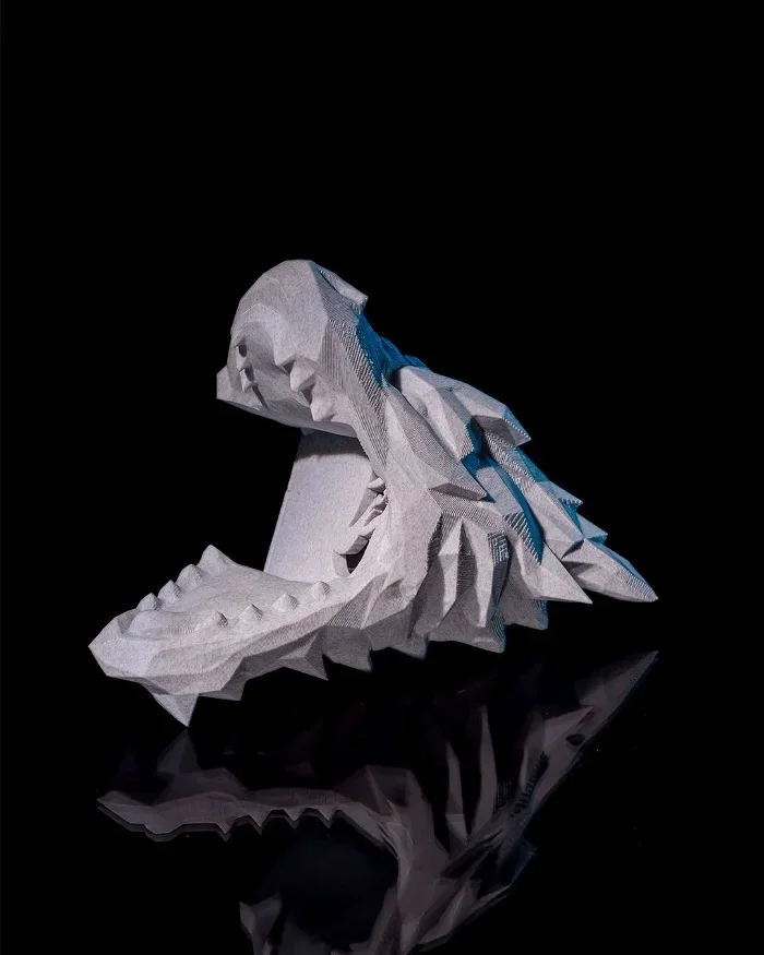 Applique murale Dragon couleur Pierre en fil PLA biodégradable et écologique. Lorsque l'applique est allumé le dragon crache le feu sur le mur. Interrupteur discret et alimentation par transfo par usb fourni, éclairage led . Dimensions: hauteur 18 cm, largeur 13 cm . Objet de décoration
